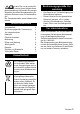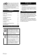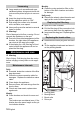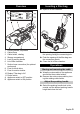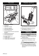 Specifications Electrical connection Voltage, EU Frequency Average power consumption Maximum power consumption Blower data Power Max. power Under-pressure Air quantity Brush Power Max. power Drive Working width Brush diameter Brush speed Dimensions and weights Height Width Length Volume of filter bag Weight Noise emission Sound pressure level (EN 60704-2-1) Machine vibrations Vibration total value (ISO 5349) Power cord EU: 8.621-716.0 12 English V Hz W W W W kPa l/s W W mm mm 1/min mm mm mm l kg 220...