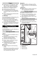 Overview Inserting a filter bag Î Open lid of filter chamber. 1 2 3 4 5 6 7 8 9 10 11 A B Pushing handle, adjustable Cable clamp Cable holder, rotating Storage compartment Lock of pushing handle Lid of filter chamber Suction hose connection (for optional suction set) Fuse for brush drive Fuse for suction turbine Display 'Filter bag is full' Power switch Appliance switch in OFF position Appliance switch in ON position Î Slide the filter bag into the basket with the opening facing the connecting hub.