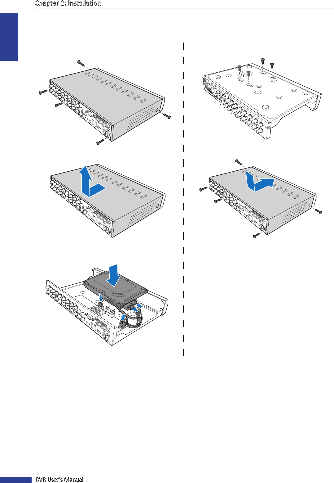 The 16-channel DVR supports supports one 3.5” SATA hard disk drive. To install the HDD, follow the steps below.