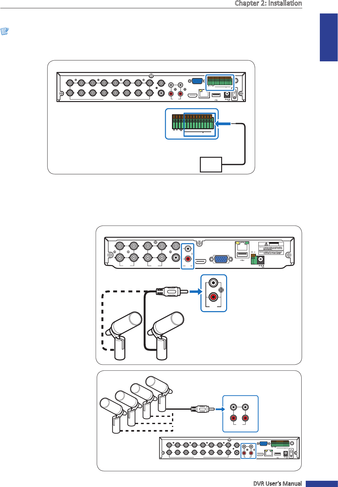 The DVR supports up to 4 audio input channels. Microphones can be connected directly via RCA connecon.