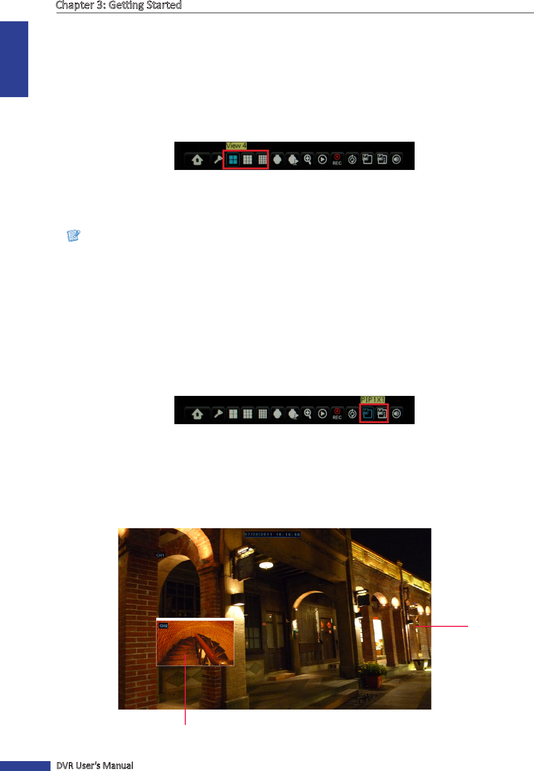 • PIP1X1: Click this icon to view another channel that will appear a mini-window frame on top of the main channel