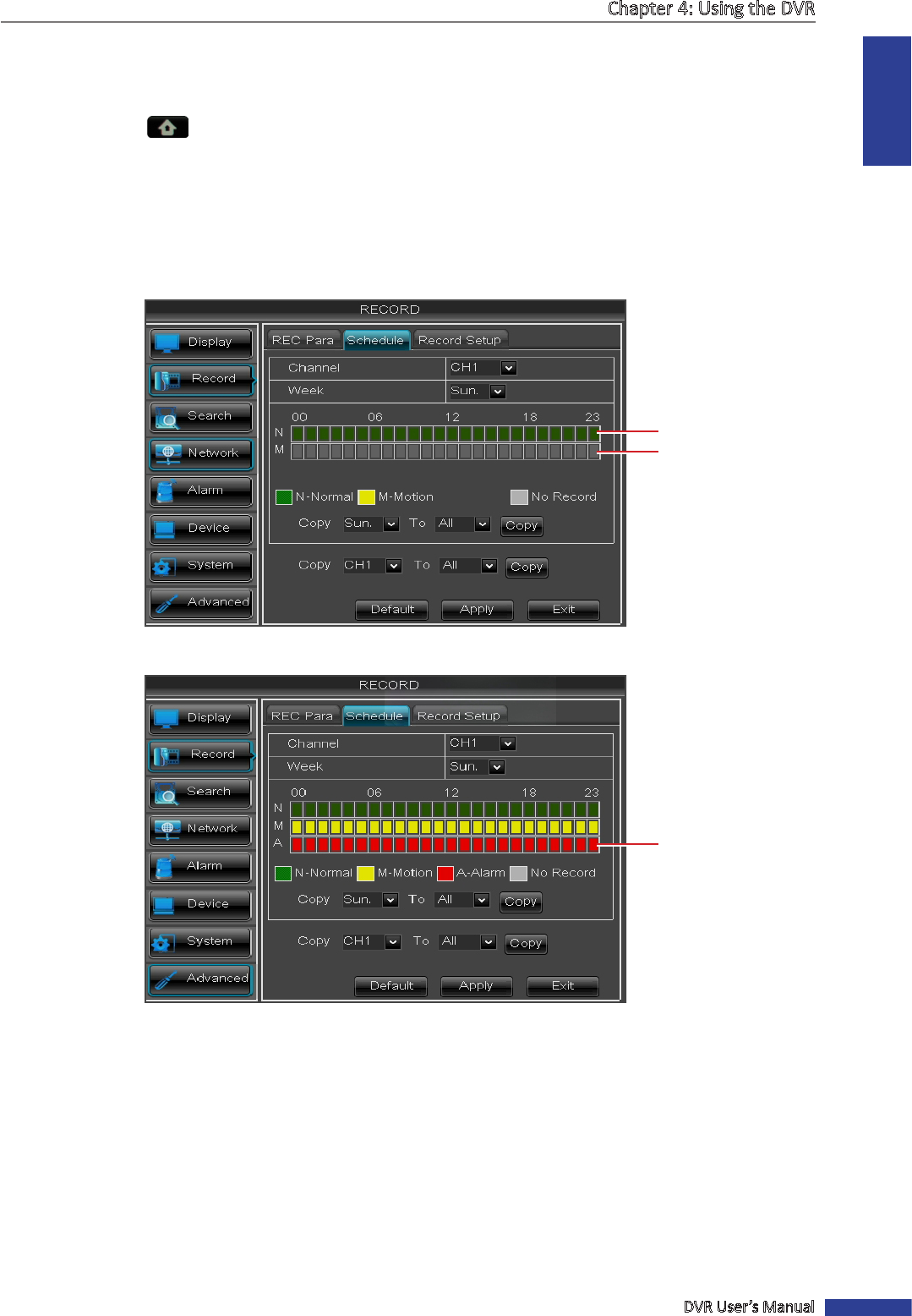 • Alarm Recording (for 16-channel only): When the me slot is marked red, the channel records only when the