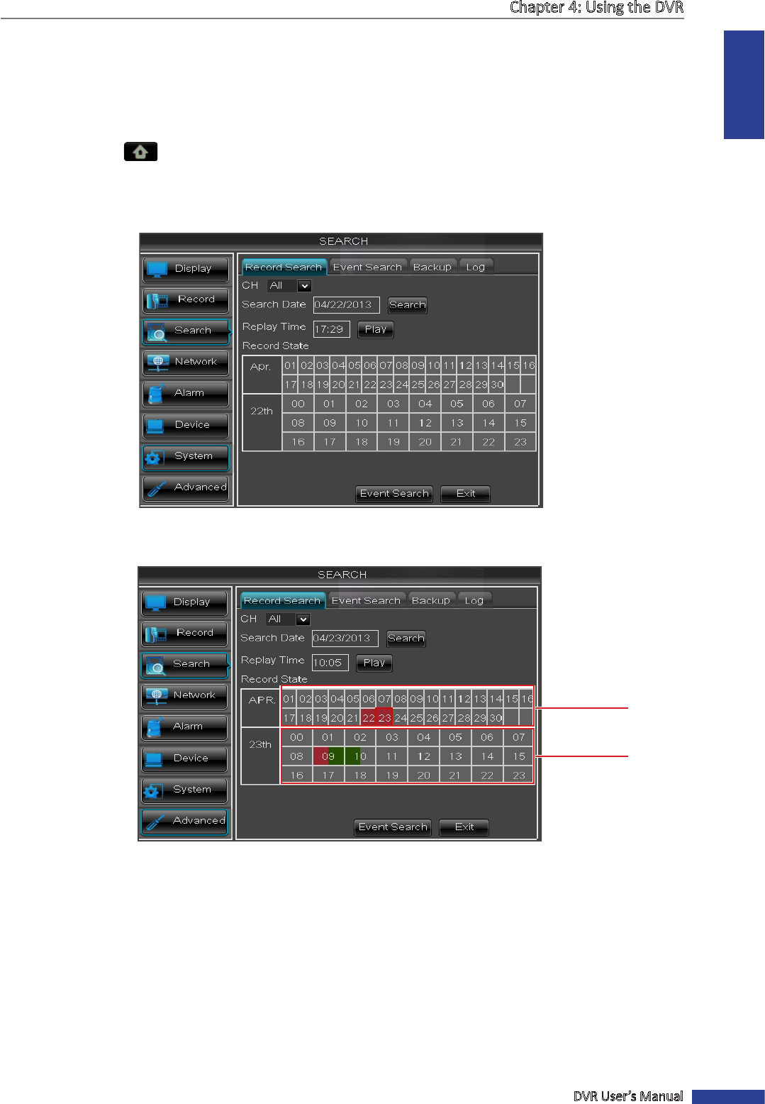 5 Click Search. The me slot of the recorded videos are marked on the Record State table. Green box means normal