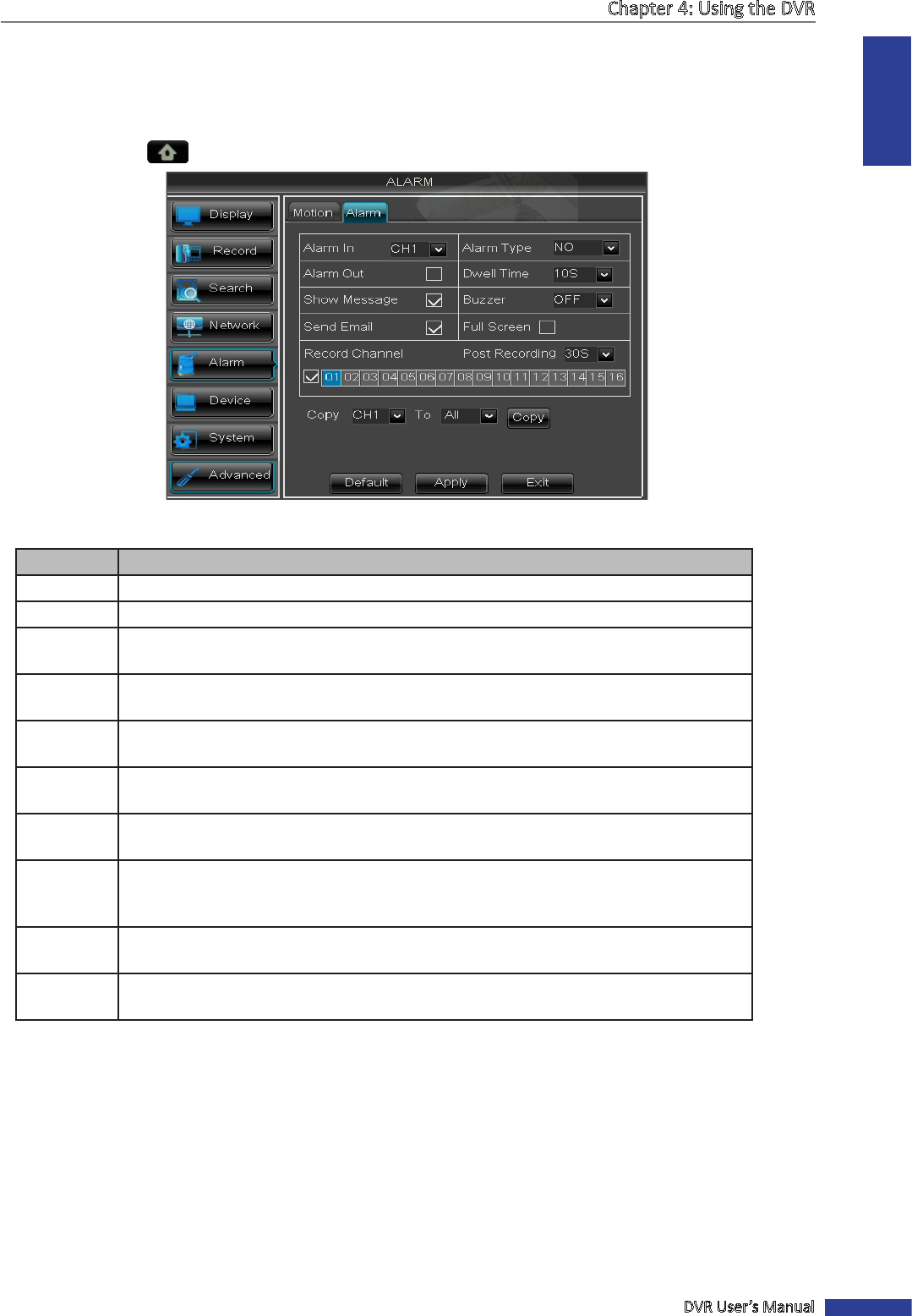 For 16-channel DVRs with a connected alarm device, do the following to set up the alarm sengs: