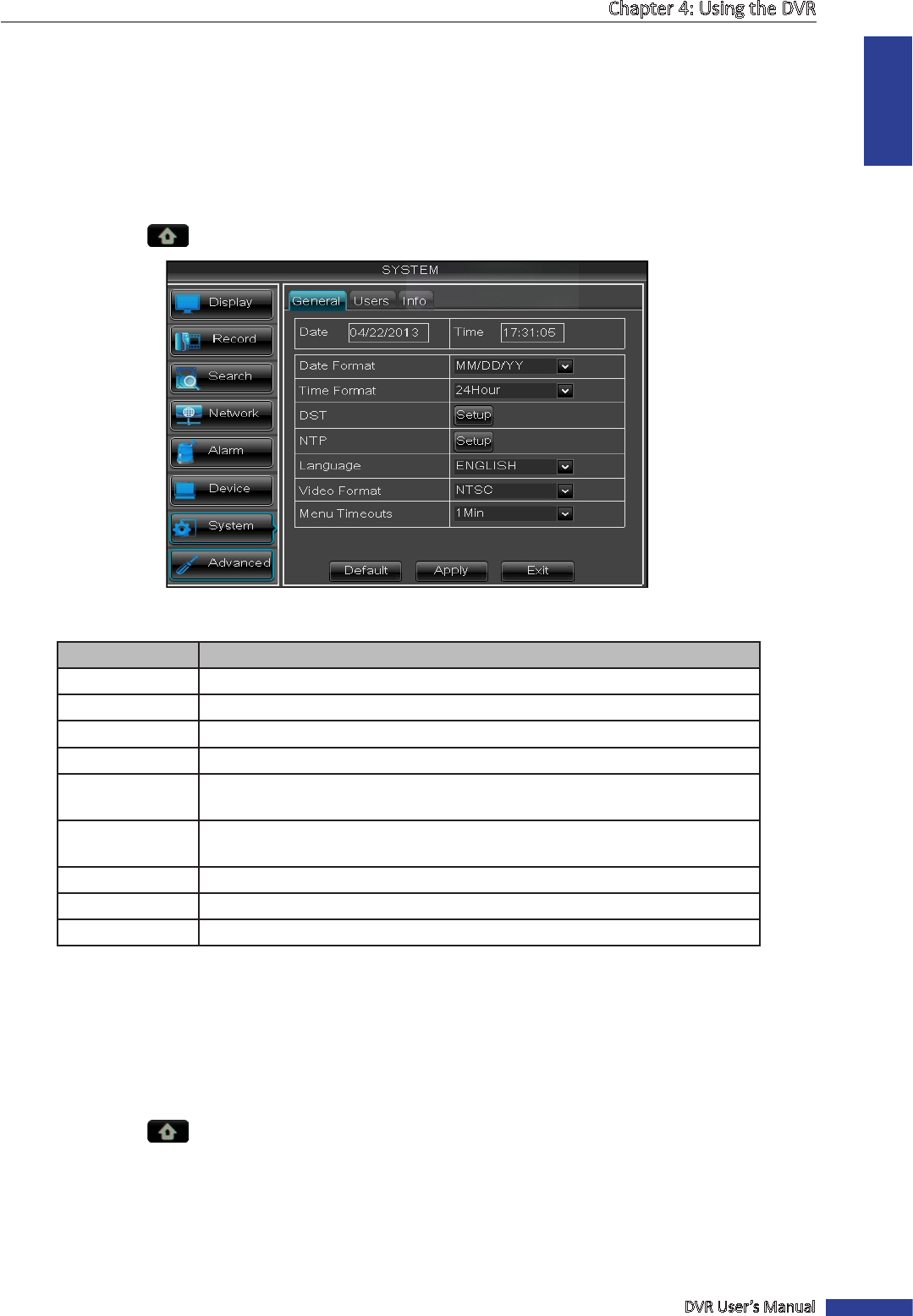 On the SYSTEM menu, you can congure the date and me, user and password, video output, on screen display
