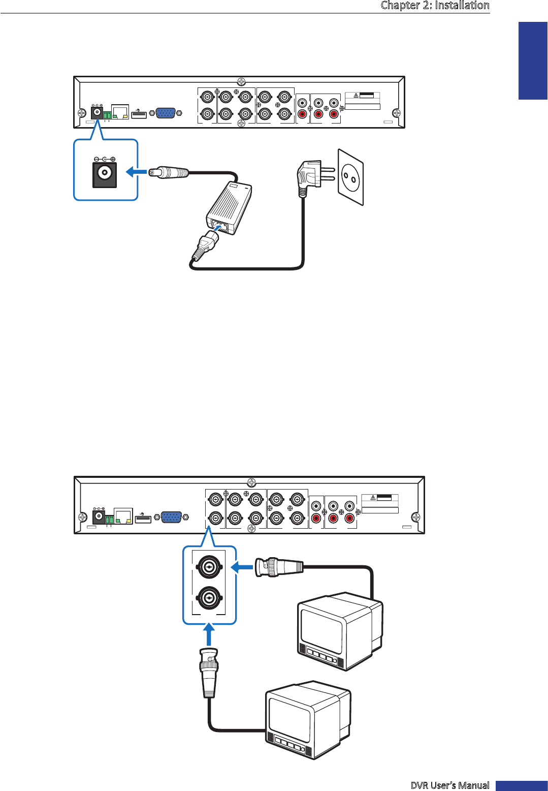 Use only the supplied power adapter and power cord that came with the DVR.