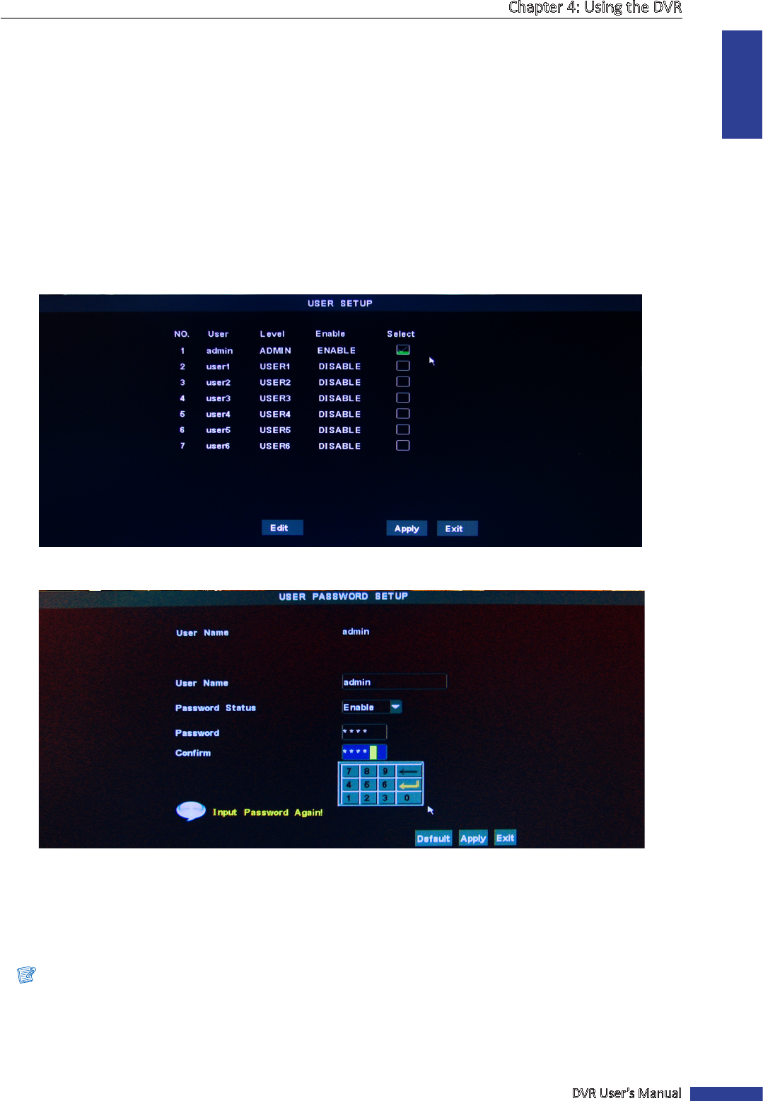 DVR. There is one administrator account and 6 user accounts. By default, the administrator account’s user name is