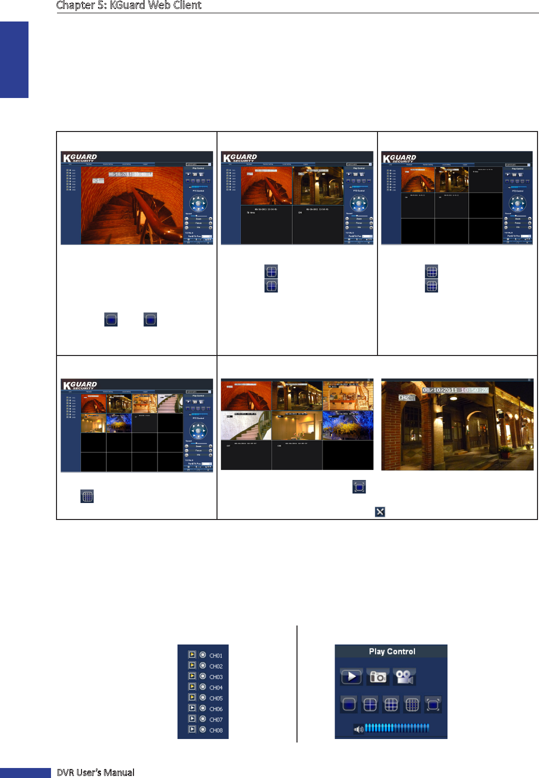 The Live screen can be viewed in dierent modes: 1-channel, 4-channel grid, 9-channel grid, 16-channel grid, and full