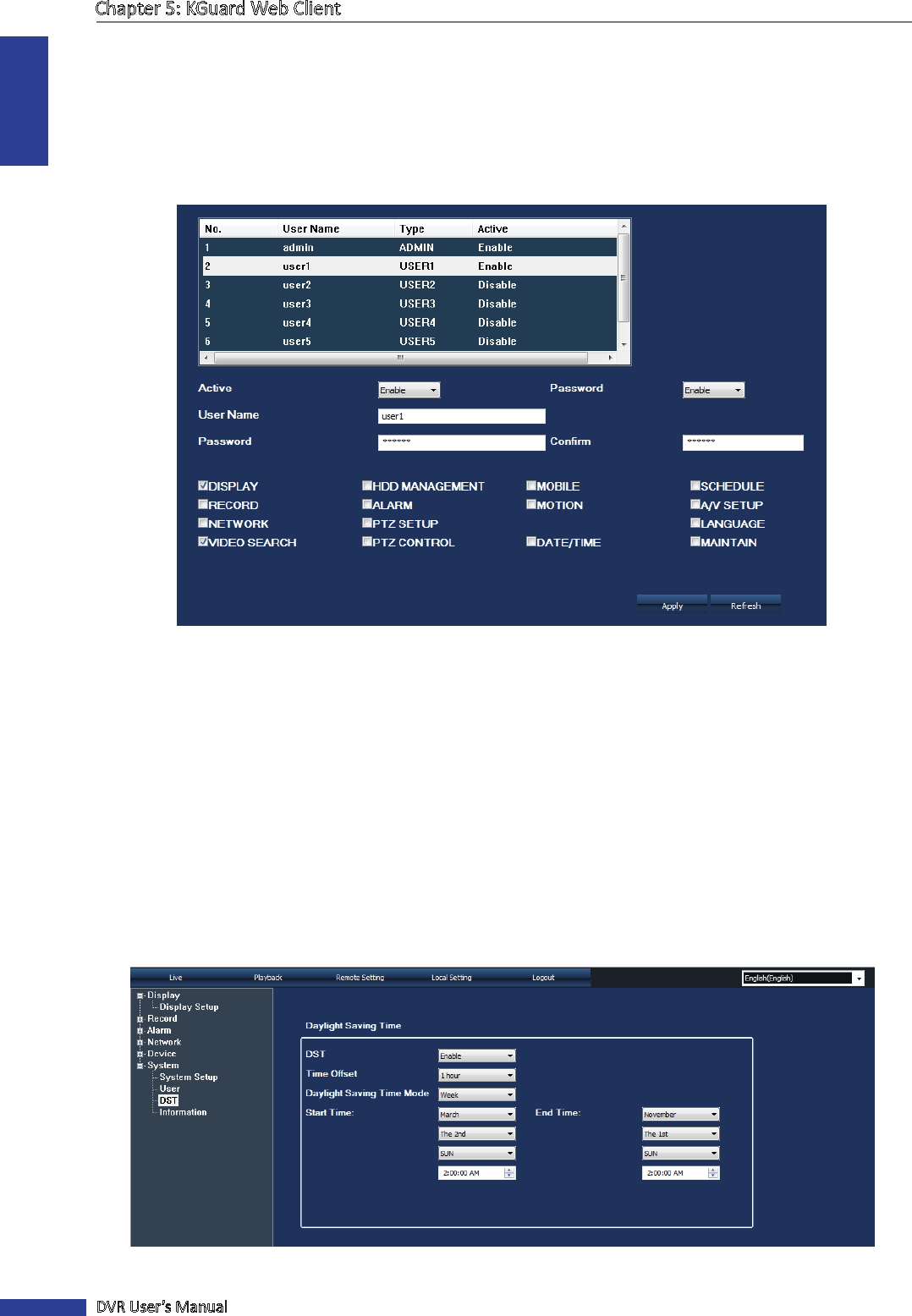 Use the DST menu to congure Daylight Saving Time (DST) on the DVR.