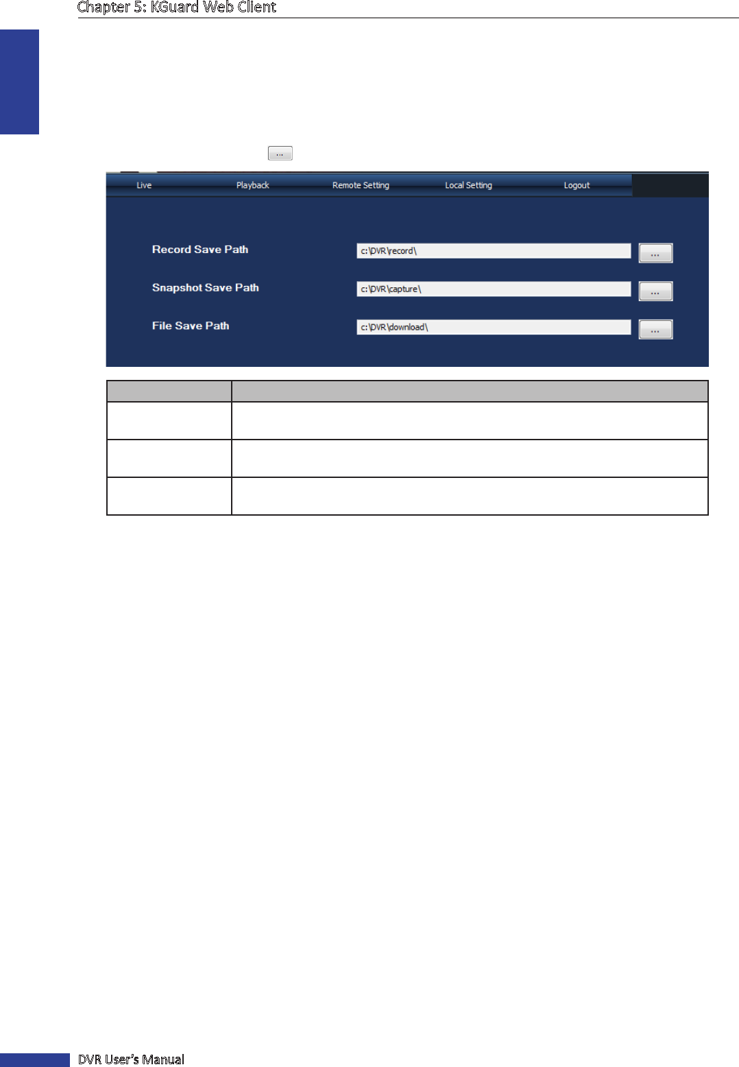 Record Save Path All manual recording made from the Live screen are saved in this path.