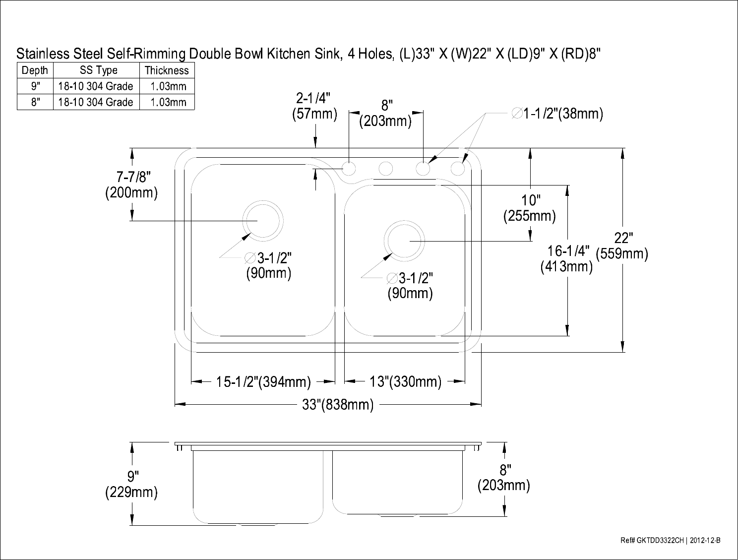 Drop-in Stainless Steel 33 in. 4-Hole Double Bowl Kitchen Sink