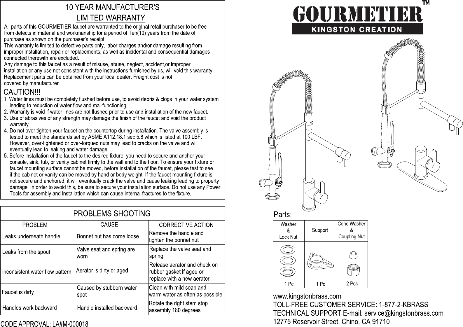 0 YEAR MANUFACTURER'S LIMITED WARRANTY All parts of this GOURMET faucet are warranted to the original retail purchaser to be free from defects in material and workmanship for a period of Ten(10) years from the date of purchase as shown on the purchaser's receipt. This warranty is limited to defective parts only, labor charges and/or damage resulting from improper installation, repair or replacements, as well as incidental and consequential damages connected therewith are excluded.