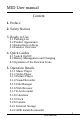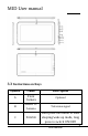 MID User manual Content 1. Preface 2. Safety Notices 3. Ready to Use 3.1 Packing List 3.2 Product Appearance 3.3 Instructions on Keys 3.4 Features Overview 4. Quick Guides 4.1 Switch On/Off 4.2 Battery Management and Charging 4.3 Operation of the Function Icons 5. Operation Details 5.1.1 Music Player 5.1.2 Video Player 5.1.3 Picture Player 5.1.4 Sound Recorder 5.1.5 File Manager 5.1.6 Web Browser 5.1.7 E-book reader 5.1.8 Calculator 5.1.9 Clock 5.2.0 Camera 5.2.1 External Storage 5.2.