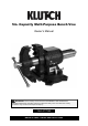 Intended Use The Klutch 5in. Capacity Multi-Purpose Bench Vise can hold a variety of work pieces. It features: • High-quality, heavy-duty, cast iron construction • Base swivels 360°/Jaws rotate 180° • Replaceable hardened steel, serrated jaws • Shot-blasted, pre-coated finish for increased durability • Pipe jaws and large anvil Note: Nuts and bolts for attaching the vise to a table are not provided and should be purchased separately.