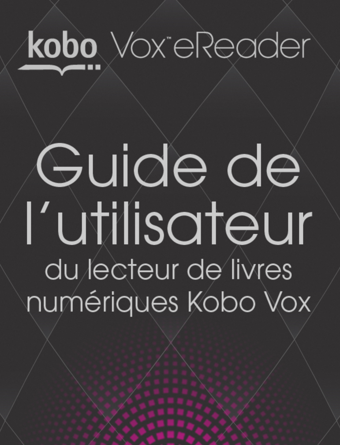Guide de lʼutilisateur du lecteur de livres numériques Kobo Vox Guide de l’utilisateur du lecteur de livres numériques Kobo VoxMC TABLE DES MATIÈRES Présentation du lecteur de livres numériques Kobo Vox ............................. 5! Anatomie de votre lecteur Kobo Vox ......................................................... 6! Chargement de la pile de votre lecteur Kobo Vox...................................... 7! Mise en marche et arrêt de votre lecteur Kobo Vox ...................................