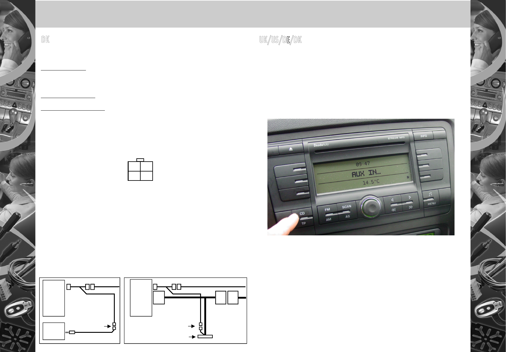 lyd system. Aux kablerne interface til bilens radio stik. Dette gør det muligt at anvende radioens AUX input uden at klippe I bilens