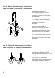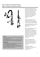 Step 5. Flushing and checking for leaks / Étape 5. Vidange et vérification des fuites 1 2 Pull the hose assembly out of the spout and remove the spray head by unscrewing it from the hose in a counterclockwise direction. Be sure to hold the end of the hose down into the sink and turn the faucet on to the warm position where it mixes hot and cold water. Flush the water lines for one minute. This flushes away any debris that could cause damage to internal parts. Check for leaks.