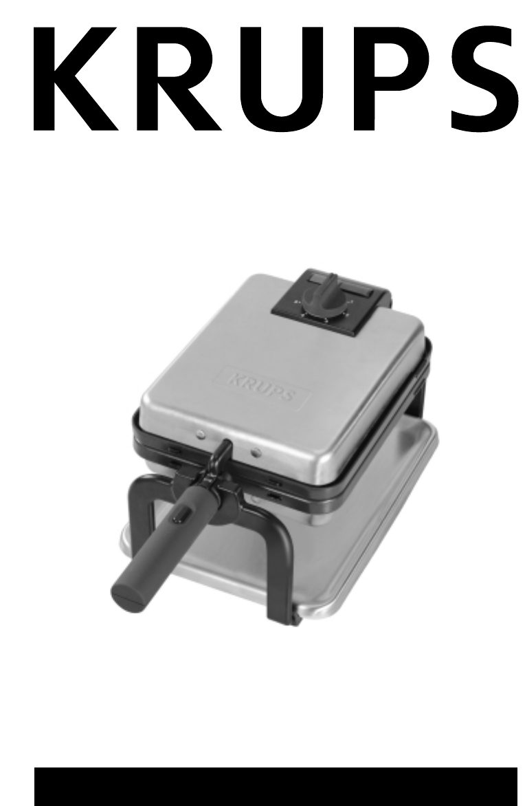 English Thank you for purchasing this KRUPS appliance. Whatever model you have, please read these instructions carefully and keep them for future reference. Description (1) a b c d e f g h i j “On/off” light (red) “Ready” light (green) Adjustable thermostat Handle release button Handle Removable waffle plates Plate retaining pins Notches for easier handling of plates Spill tray Non-removable cord For U.K.