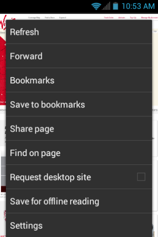 ● Share page: Allows you to send a URL via Gmail, SMS, Email, or Bluetooth.