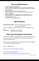 Care and Maintenance • • • • • • • • Do not mix old and new batteries Do not mix Alkaline, Standard, Lithium or Rechargeable Batteries Always purchase the correct size and grade of battery most suitable for intended use. Replace all batteries of a set at the same time. Clean the battery contacts and also those of the device prior to battery installation. Ensure the batteries are installed with correct polarity (+ and -).