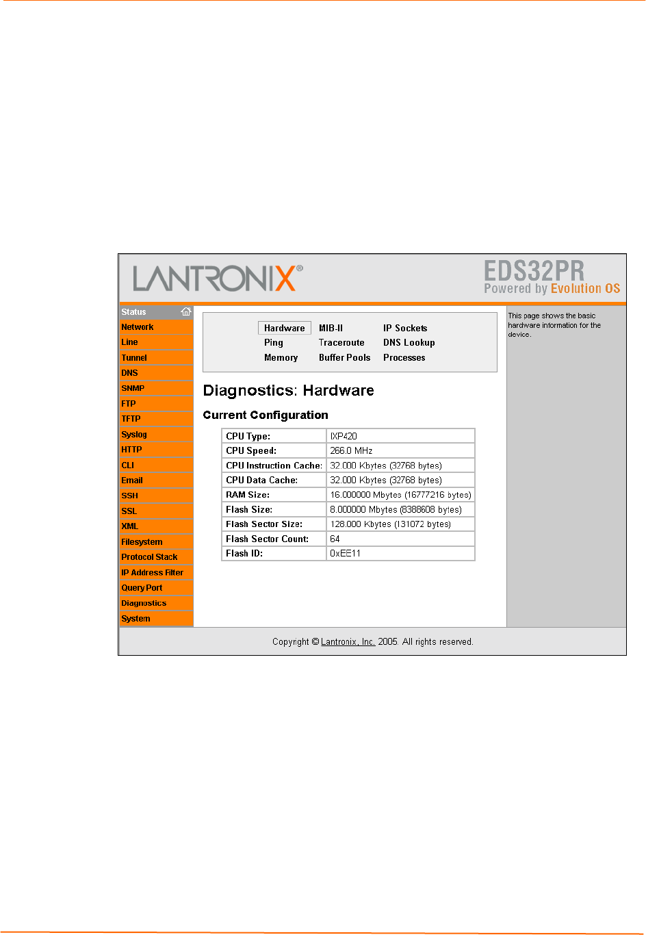 click the Diagnostics link in the menu bar to display the Diagnostics: Hardware page.