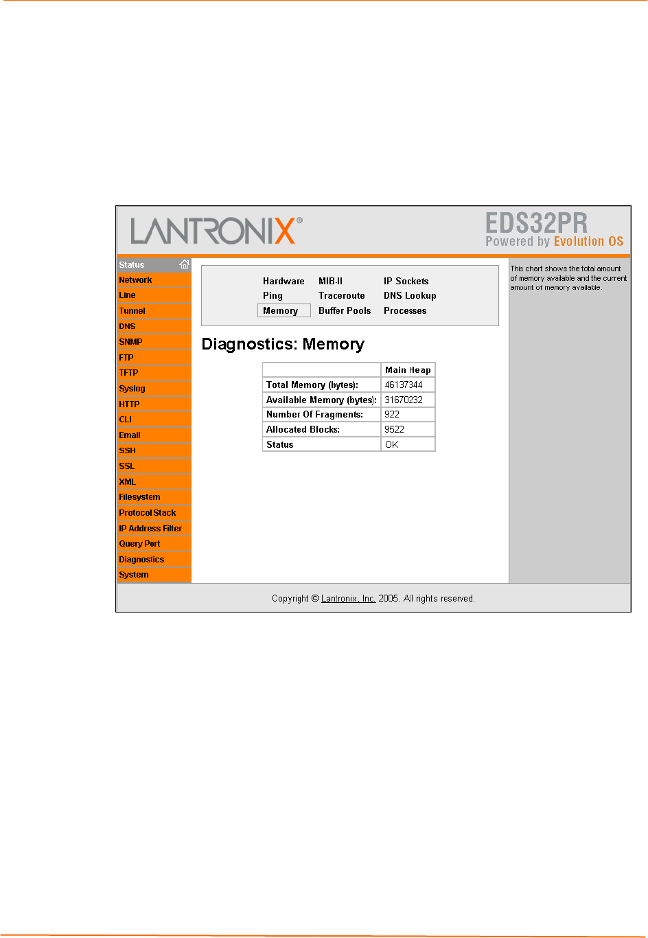 Clicking Memory from one of the Diagnostics pages displays the Diagnostics: Memory.