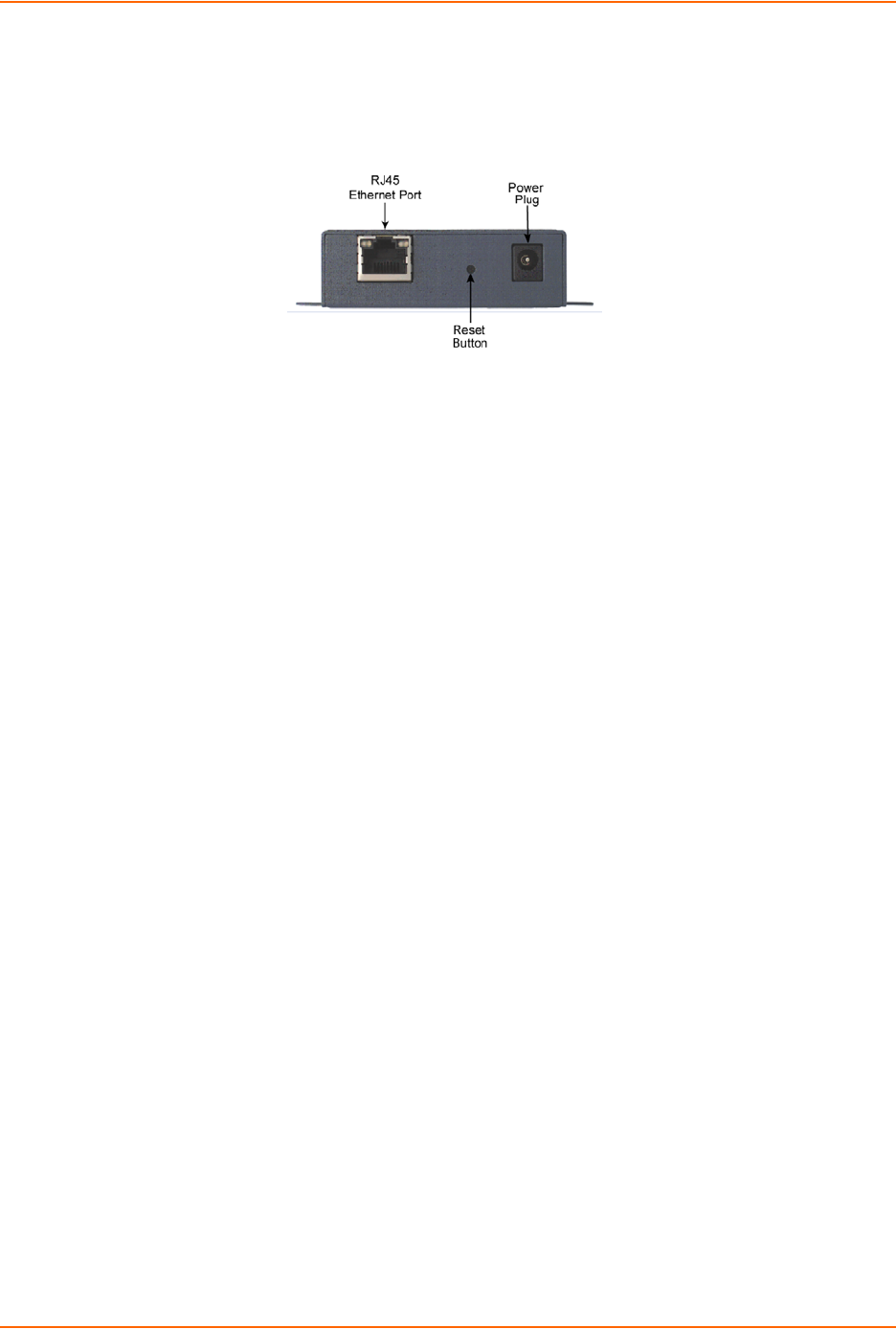 On the EDS1100 back panel, there is a power plug, reset button, and an RJ45 (10/100) Ethernet