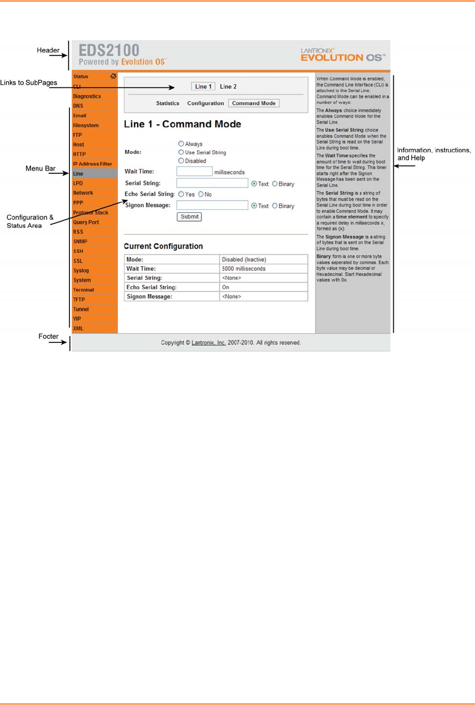 At the very bottom, the copyright information displays with a link to the Lantronix home page.