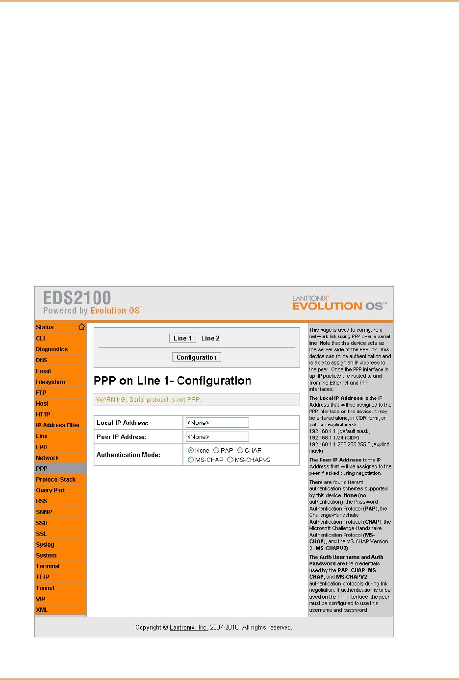 Use the EDS1100/2100 Web Manager or CLI to configure a network link using PPP over a serial