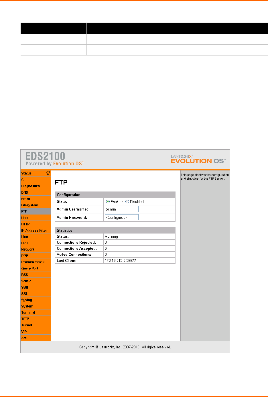 The FTP web page shows the FTP configuration and statistics about the FTP server. To configure