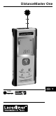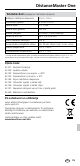 DistanceMaster One Tehniskie dati (Lespējamas tehniskas izmaiņas) Iekšējais mērīšanas diapazons 0,2 m - 18 m Precizitāte (tipisks)* ± 3 mm / 10 m Lāzera klase 2 < 1 mW Lāzera viļņu garums 650 nm Strāvas piegāde 2 x AAA 1,5 Volt baterijas Izmēri (p x a x d) 48 x 112 x 24 mm Svars (ieskaitot baterijas) 109 g Automātiskās izslēgšanās režīms pēc 30 sek. lāzers / pēc 3 min.