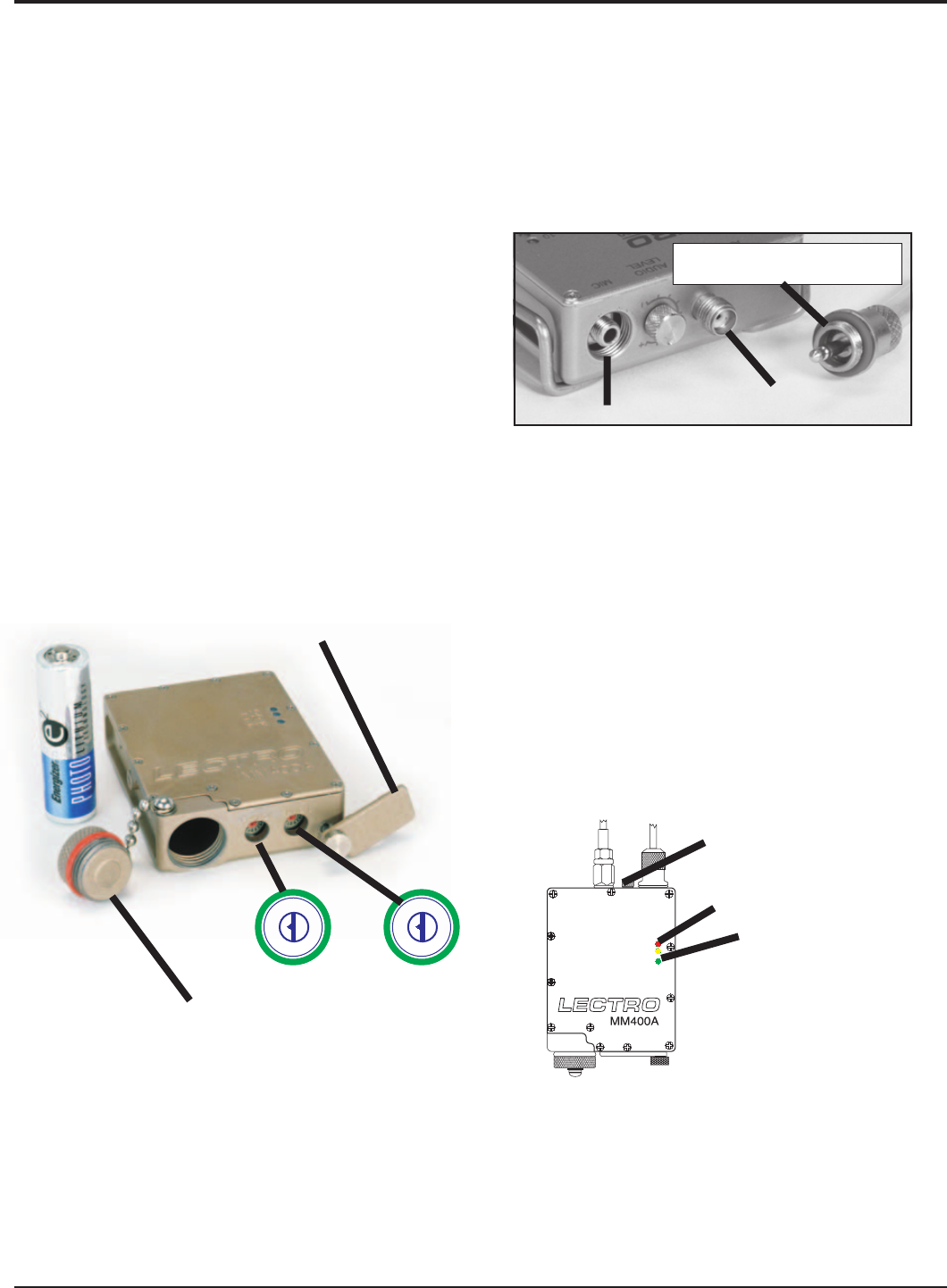 At -20 dB, the -20 LED glows green. At -10 dB, both the