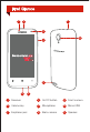 First Glance 1 2 7 3 8 4 9 6 5 1 Receiver 2 On/Off button 3 Front camera 4 Volume key 5 Microphone 6 Micro USB 7 Earphone jack 8 Back camera 9 Speaker