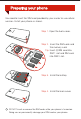 Preparing your phone You need to insert the SIM card provided by your carrier to use cellular services. Install your phone as shown. Step 1. Open the back cover. SIM 1 Step 2. Insert the SIM cards and the memory card. Tip: Insert (U)SIM card into SIM 1 slot and SIM card into SIM 2 slot. SIM 2 micro SD 1 3 2 Step 3. Install the battery. Step 4. Install the back cover. DO NOT insert or remove the SIM cards while your phone is turned on. Doing so can permanently damage your SIM card or your phone.