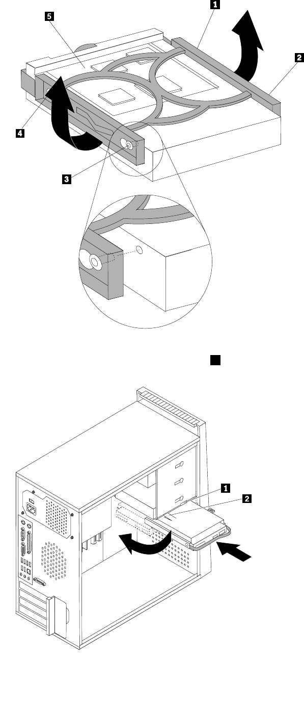 9.Alignthedrivecagepivotpinwiththeslot1intheupperdrivecageandslidetheharddiskdrive