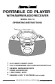 ® PORTABLE CD PLAYER WITH AM/FM RADIO RECEIVER MODEL CD-110 OPERATING INSTRUCTIONS PLAYS MUSIC COMPACT DISCS FULLY PROGRAMMABLE CD PLAYER WITH REPEAT PLAY RECEIVES AM/FM BROADCASTS POWER LED INDICATOR 2 WAY POWER - AC/DC REQUIRES 6 SIZE D BATTERIES (not included) PLEASE READ CAREFULLY BEFORE USE IB-CD110(SY)-WM-E-V1