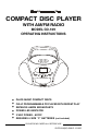 COMPACT DISC PLAYER WITH AM/FM RADIO MODEL CD-109 OPERATING INSTRUCTIONS PLAYS MUSIC COMPACT DISCS FULLY PROGRAMMABLE CD PLAYER WITH REPEAT PLAY RECEIVES AM/FM BROADCASTS POWER LED INDICATOR 2 WAY POWER - AC/DC REQUIRES 6 SIZE C BATTERIES (not included) PLEASE READ CAREFULLY BEFORE USE IB-CD109(AD)-WM-E-121302
