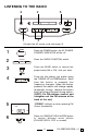 LISTENING TO THE RADIO 2 3 6 4 1 Connect the AC power cord (see page 3). Press the POWER switch, the AC POWER STANDBY INDICATOR will be off. POWER 1 2 Press the RADIO FUNCTION switch. FUNCTION RADIO TAPE CD 3 Press the BAND switch to choose the proper band (AM or FM ) that you want. 4 Tune into the station you prefer using the TUNING UP or DOWN button. Each time the button is pressed, the frequency changes.