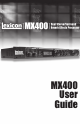 Introduction MX400 Introduction Congratulations and thank you for purchasing the MX400 Dual Stereo/Surround Reverb Processor! The MX400 provides you with the legendary Lexicon reverbs and effects powered by four processors, for a wide variety of configurations and blends, all in a single rack unit. Use the MX400 live or in the studio, connect and control it via your PC or Mac, or use it as a hardware plug-in.