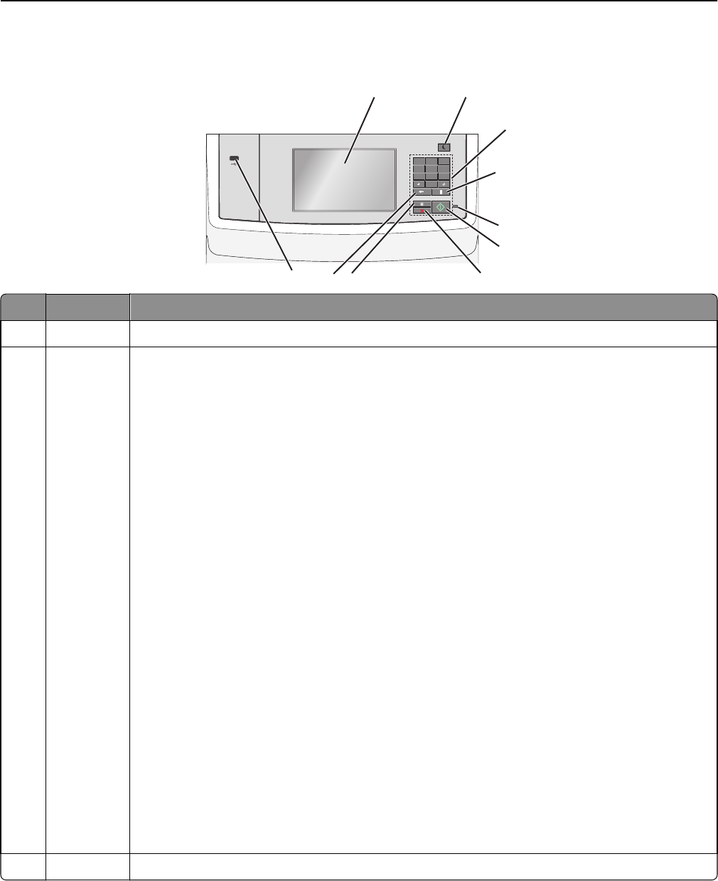 1 Display View printing, e‑mailing, copying, and faxing options, as well as status and error messages.