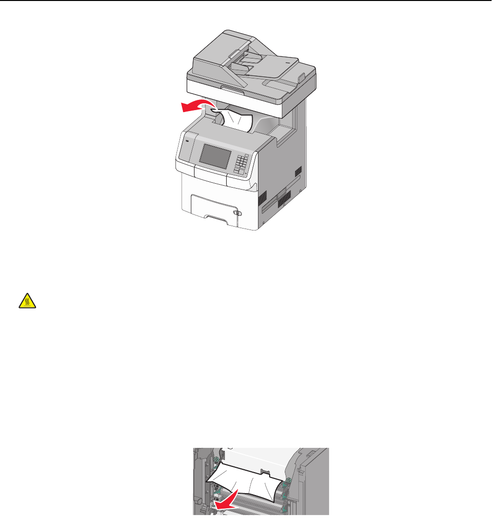 a If the jammed paper is visible under the fuser, then firmly grasp the paper on each side, and then gently pull it