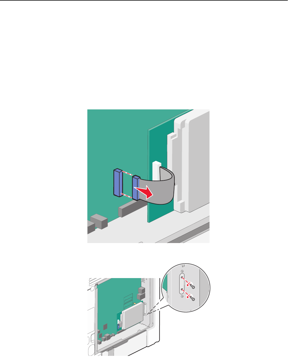 3 Remove the screws that connect the printer hard disk to the system board cage.