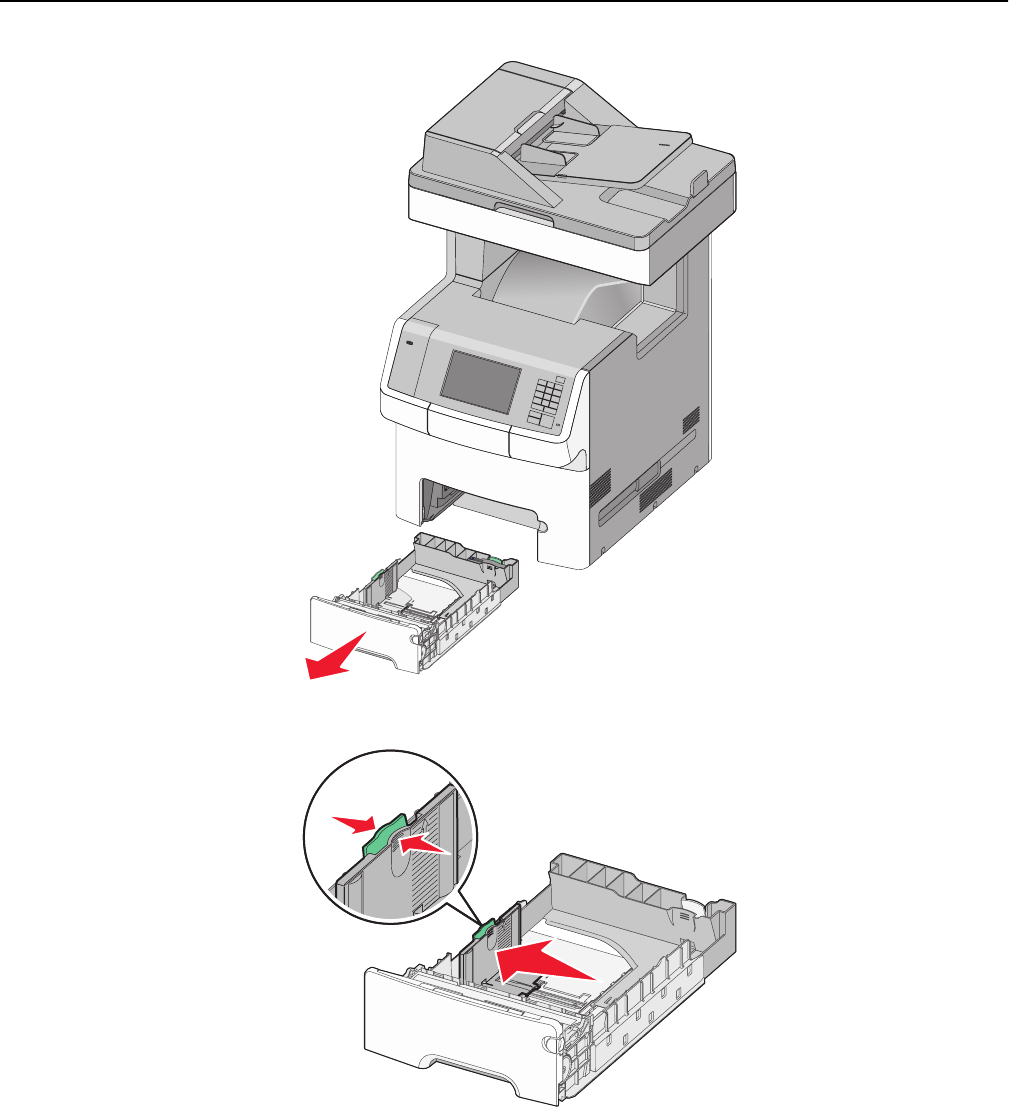 Note: Use the paper size indicators at the bottom of the tray to help position the length and width guides.