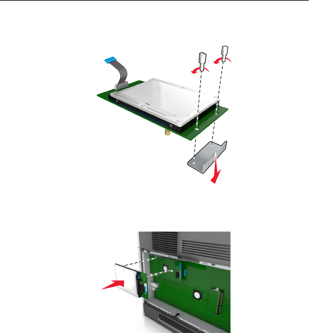 b Align the standoffs of the printer hard disk to the holes in the ISP, and then press the printer hard disk down