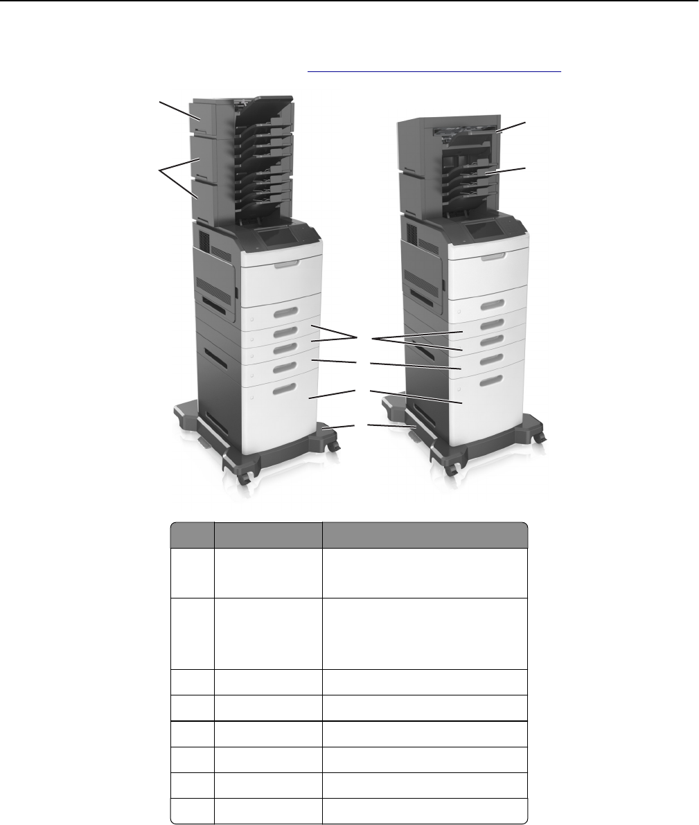 The following illustration shows the maximum number of optional finishers and trays that are supported by the printer.