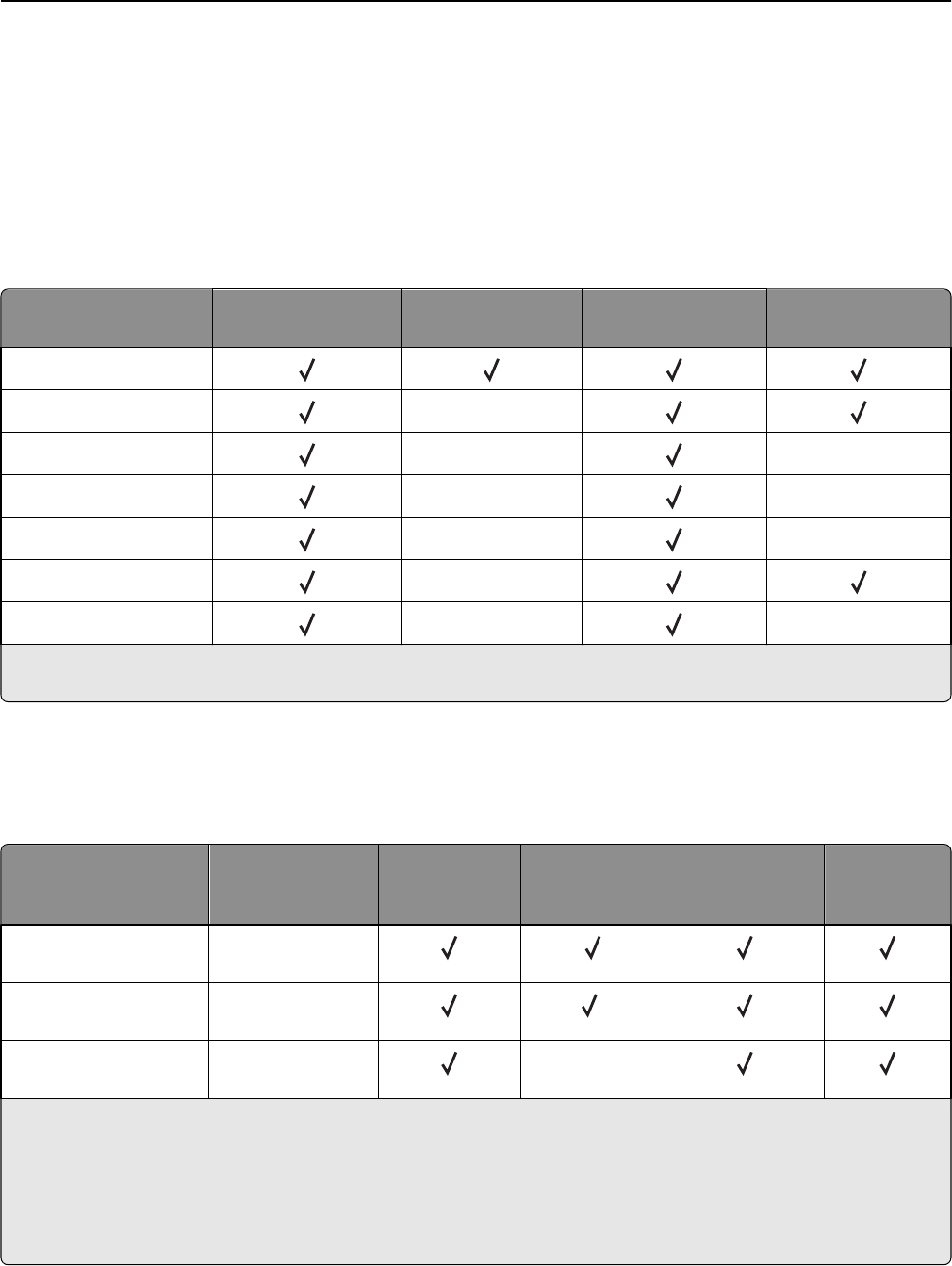 The following tables provide information on standard and optional paper sources and the types of paper they support.