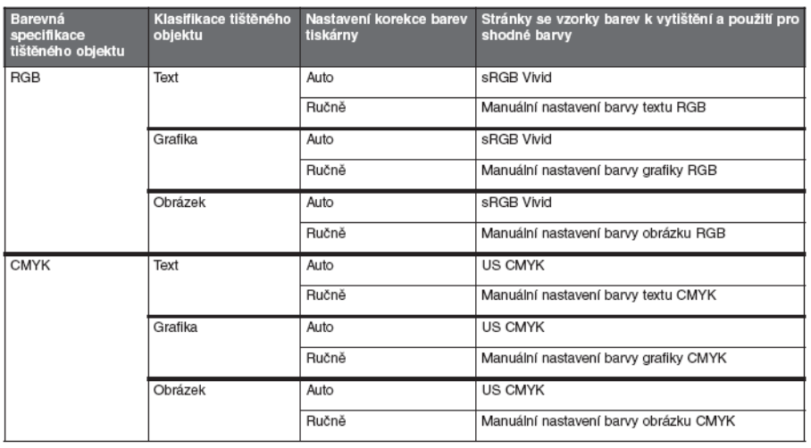 použitém nastavení položky Úprava barev (Auto, Off nebo Manual), typu tištěného objektu (text,