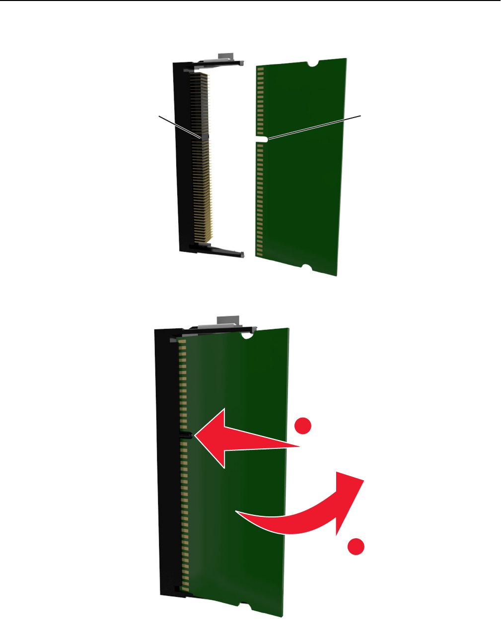 3 Breng de uitsparing (1) op de geheugenkaart op één lijn met de ribbel (2) op de connector.