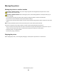 Maintaining the printer Periodically, certain tasks are required to maintain optimum print quality. Cleaning the exterior of the printer 1 Make sure that the printer is turned off and unplugged from the wall outlet. CAUTION—SHOCK HAZARD: To avoid the risk of electric shock when cleaning the exterior of the printer, unplug the power cord from the wall outlet and disconnect all cables to the printer before proceeding. 2 Remove all paper from the printer. 3 Dampen a clean, lint‑free cloth with water.