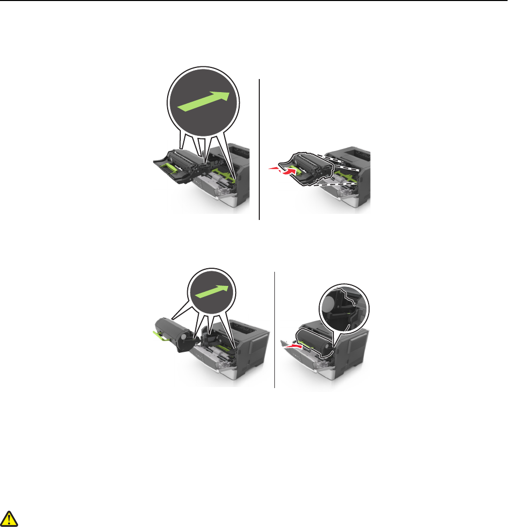7 Insert the toner cartridge into the printer by aligning the side rails of the cartridge with the arrows on the side rails